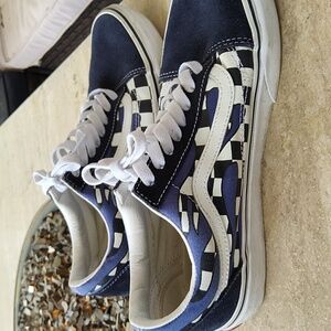 Vans sneakers, size 8 1/2 for men, size 10 for Women, Old Skool checkboard white & blue design with flame, good preloved condition, some scuffs and marks (pictured), lace up shoes