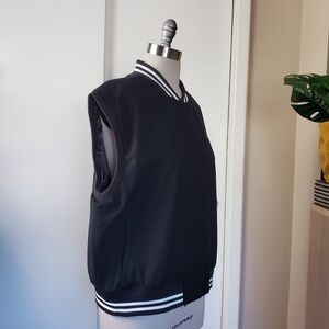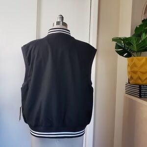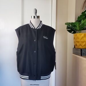 Design/Details: Vans unisex design sleeveless varsity-style jacket. Its classic black and white combo makes it both transitional for seasons and effortless for layering. Design also features lining, premium fabric, and side pockets.