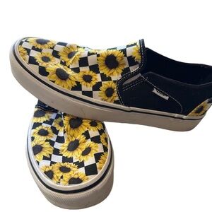 Vibrant Vans slip-on sneakers with sunflower and checkered design. Comfortable and stylish for everyday wear.