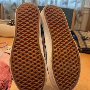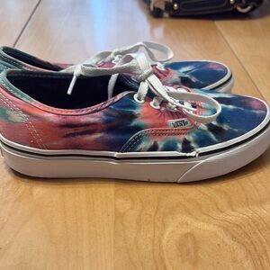 Vans tie-dye canvas sneakers with a vibrant design. Features a mix of blue, pink, and white colors. Perfect for casual wear. Size 6.5
