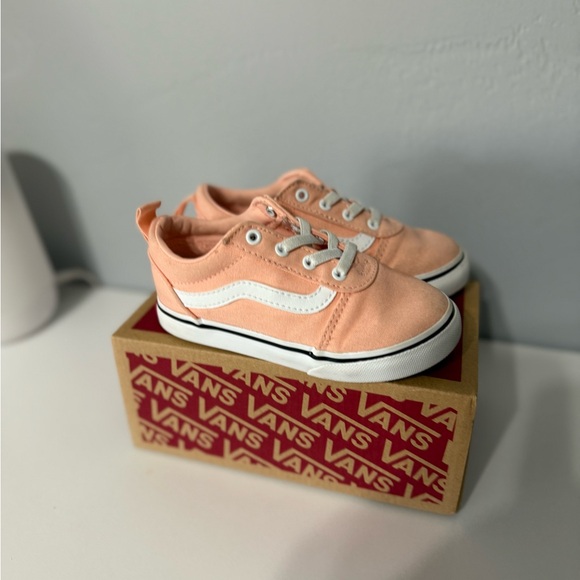 Stylish and comfortable Vans sneakers in a charming peach color. Perfect for everyday wear. These are very gently worn with some subtle imperfections shown.
