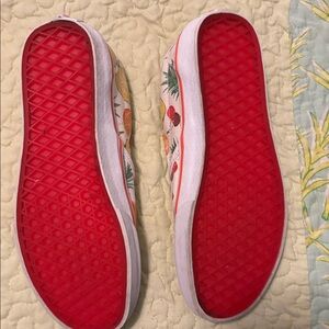 Vans slip-ons with a colorful tropical fruit design. Features pineapples, cherries, and strawberries on a soft pink base. They have a tiny clear glitter on the canvas that makes them shine in the sun. Worn a handful of times, I’m into sandals now so time to make room in my closet at home.