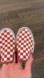 Vibrant red and white checkered design. Slip-on style for easy wear. Perfect for active kids.