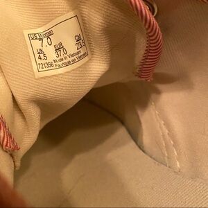Vans red and white striped low top lace up sneakers with light embroidered polka dots through, size women’s 7. Has a vintage design/pattern to them. Great used condition; minimal wear to the tread. Light marks to the white outer rim and canvas, as shown in pictures.