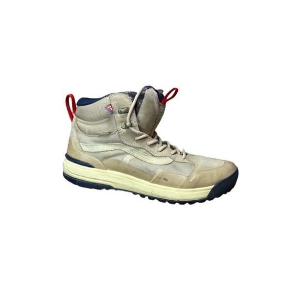 The Vans UltraRange Boots Mens Size 11 EXO High MTE-2 Primaloft Hydroguard Winter are designed for winter weather with a waterproof construction and rubber outsole for traction. These lace-up boots have a round toe, ankle shaft style, and standard shoe width for a comfortable fit. The beige color and logo accents give them a stylish look, while the synthetic upper material and foam insole provide durability and comfort. Perfect for outdoor activities, casual wear, or workwear in cold weather conditions, these Vans boots are a practical and fashionable choice for the winter season.
