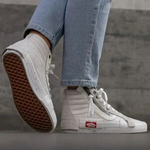 Deconstructed incarnations of our most beloved silhouettes push boundaries unexpectedly out of the ordinary with a distorted DIY, cut-and-paste treatment. Featuring exposed materials and irregular techniques, the Glitter Mix Sk8-Hi Reissue Cap utilizes the legendary reissued Vans high top silhouette with a side zipper entry and pieced suede and leather uppers for an “inside-out” feel. It also includes padded collars for support and flexibility, and signature rubber waffle outsoles.