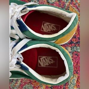 Vans | Unisex primary colored Old Skool ‘Yacht Club’ lace up sneakers. Blue and yellow suede patches, green and red canvas. Great tread! Men’s size 9, Women’s size 10.5