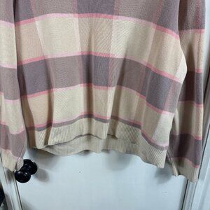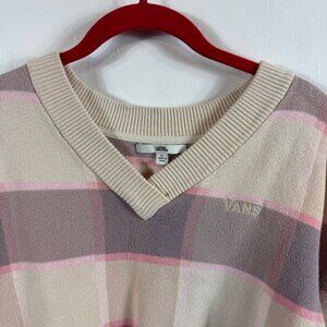Vans V-Neck Sweater Women’s Large Pink Beige Plaid Check Knit 100% Cotton