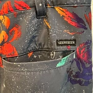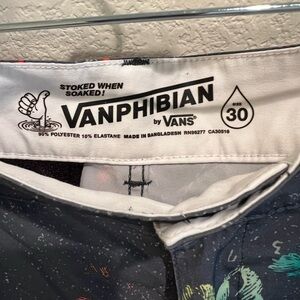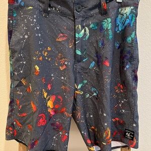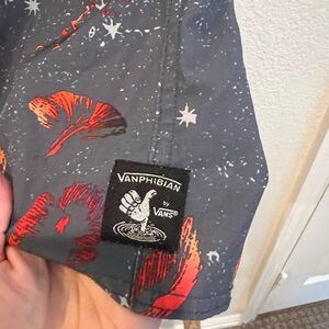 Stylish Vans shorts with a cosmic print. Features red and gray tones. Unique and trendy design. 159