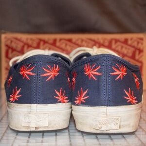 Vans Vault Authentic. Navy blue with bright coral colored "palms". Used but in good shape. Missing insoles as they were replaced sometime in the past and I no longer have the replacements. Mens size 9.5. Does not come with box and is sold as is. Slight blemish on left side shoe by vans tag on uppers. Not sure what material these are made out of.