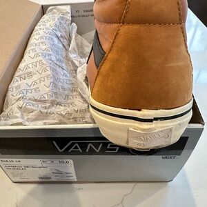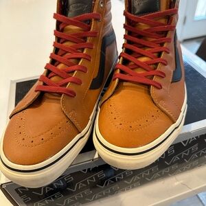 Stylish Vans high-tops with tan leather and black stripe. Red laces add a bold touch. Ideal for casual wear.
