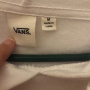 Vans hoodie with a white body and black checkerboard accents on the sleeves.