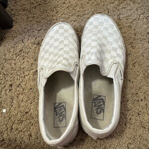 Vans slip-on shoes with a white checkered design. Easy to wear and versatile.