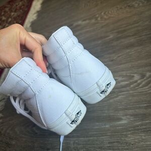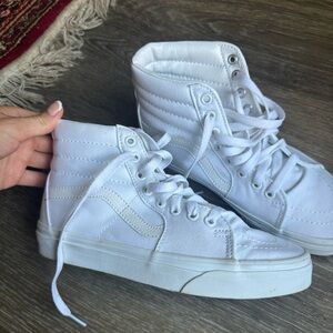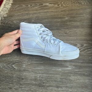 White, high-top vans. Barely worn. Got them for weight lifting, after one use, realized toe box is too narrow for me. Priced to sell.