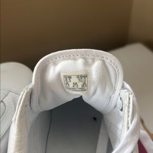 These Vans sneakers feature a classic low-top silhouette with a monochromatic white canvas and leather upper. The signature Vans side stripe and elevated platform sole add a touch of style, making them a versatile choice for any casual outfit.