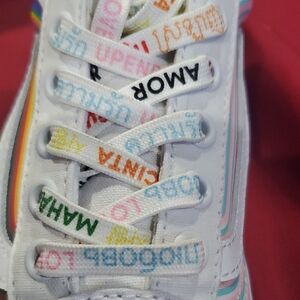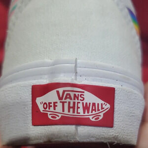 Stylish Vans sneakers. White base with vibrant rainbow stripes on one side pastel rainbow stripes on other used excellent condition minor scuffs shown in photos. Perfect for casual wear.