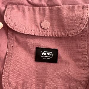 The Vans Minette Woven Shacket is a relaxed fit jacket made of cotton twill fabric in a dusty rose pink color. Same jacket in all pics just different light. Looks pinker in shadow and terracotta in bright light. It features a snap closure, long sleeves, and a Vans logo accent. Plenty of large patch and flap pockets. The shacket has a solid pattern and is hip-length, making it suitable for t ravel, casual, and workwear. The jacket is designed for women and comes in size small.