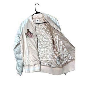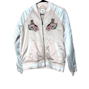 Vans Womens Bomber Jacket Tiger Floral Embroidery Baseball Pink Varsity S. Good condition there are some spots on the sleeves and some piling on the trimming material. Embroidered tigers on the front and flowers on the back. Zipper in front.