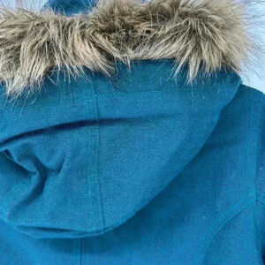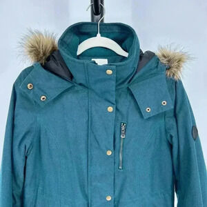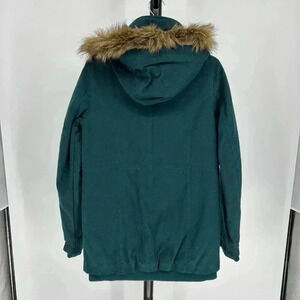 Vans Women's Cadet Parka in a size medium. The color is a beautiful dark jewel tone green, gold buttons and a faux fur hood that can be removed when washed. The color was hard to photograph consistently, but it is best represented in the close up picture of the garment tag. Excellent used condition. Minimal wear. Drawstring inside to synch waist. Please see photos of measurements to ensure fit.