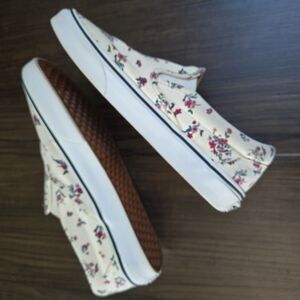 Step into style with Vans Women's Floral Slip-On Shoes. Featuring a cream background with a charming floral pattern, these shoes offer both comfort and fashion. Perfect for casual outings.