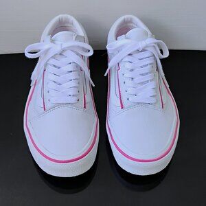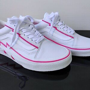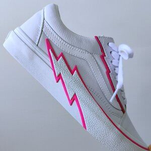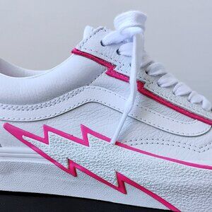 Vans Women's Old Skool Bolt Leather Sneaker in Awesome Pop Pink Glow / White ~ Brings an electric energy to a timeless favorite. This Low-Top sneaker is made with sturdy suede and canvas uppers, re-enforced toe caps, supportive padded collars, and signature rubber waffle outsoles :)