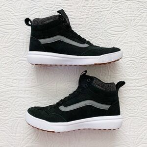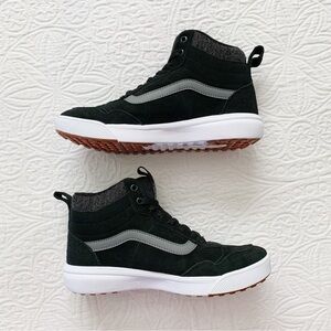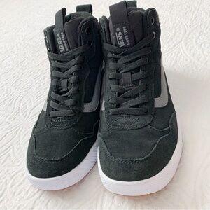 Marked size 9.5. Skate-inspired high-top lace-up sneakers with signature Vans side stripe and padded collar for extra comfort. Water-resistant suede upper, rubber outsole.