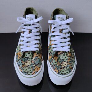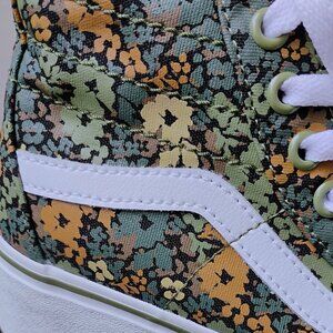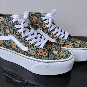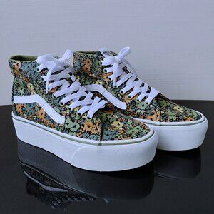 Vans Women's Sk8-Hi Tapered Canvas Platform Sneaker in Amazing Camo Floral Loden Green ~ This model incorporates a striking combination of camo floral print and loden green, creating a unique visual appeal that merges urban fashion with a touch of femininity. The high-top profile maintains the classic elements of the Sk8-Hi, offering both ankle support and an iconic look that has been a staple in the skateboarding community and streetwear fashion circles for decades. The tapered design gives it a streamlined fit, making it not only a functional piece of footwear but also a fashion statement that can be paired with a wide variety of outfits, whether casual or edgy :)