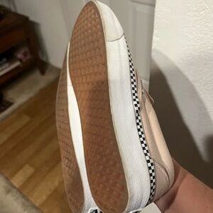 Stylish Vans slip-on sneakers. Light pinkish cream canvas with white accents. Classic checkered trim.