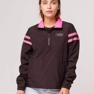 Vans After Dark Reflective Womens Anorak Jacket. The After Dark Anorak is a 100% polyester pullover anorak jacket with a high neck, quarter zip, pop color lining at the collar, and welt pockets. It also includes reflective taping the sleeves, and a reflective logo screen print at the chest.