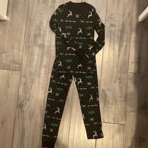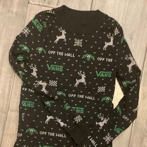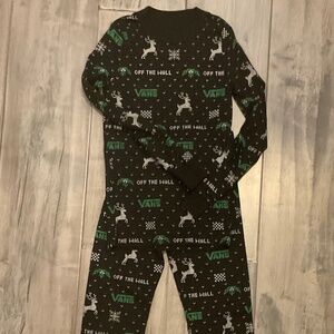 Perfect for the holidays! Black vans two piece pajama set. Long sleeve with ribbed accent at wrist. PJ pants with ribbed accent at ankle. Excellent condition. Worn once! Size 10