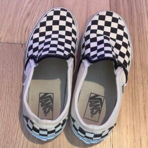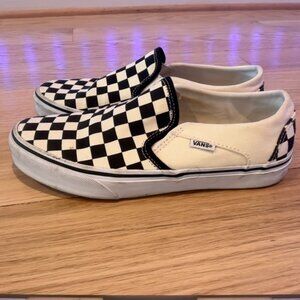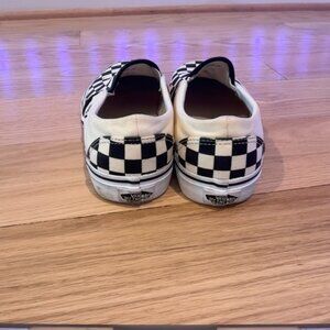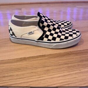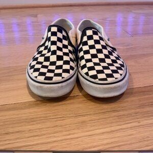 These shoes are the brand of Van's and are a size 8 in women's. They are black and white checker board design style and these shoes haven't been worn many times.