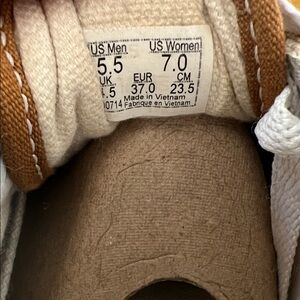 Classic Vans sneakers women’s size 7/ Men’s size 5.5. Orangish brown suede upper with white laces and sole for a clean look. Perfect for casual wear. Last photo has another look at the color in different lighting.