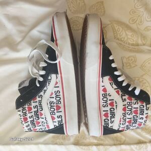 ▪︎DESCRIPTION: Black and white with "I ♡love boys and I ♡ love Girls" with red hearts. Skateboard high top sneaker