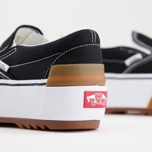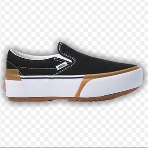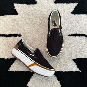 Classic Stacked Vans platform shoes with a black upper and white sole. Tan accents add a unique touch. Features the iconic 'Off The Wall' logo on the heel.