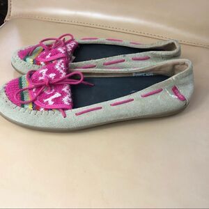 Vans suede leather moccasins with pink design on top Size 7 but runs small