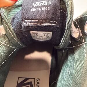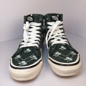 This is the highly sought-after Vans x Sandy Liang SK8-Hi collaboration, featuring a unique, elevated design. The classic high-top silhouette is constructed with a dark green canvas upper adorned with delicate embroidered blue and yellow floral motifs. The shoe maintains signature Vans elements like the white laces and waffle outsole, but is updated with thick, contrast stitching that highlights the panels. The footbed is co-branded "VANS x SANDY LIANG". This sneaker is a perfect blend of skate heritage and New York-based designer Sandy Liang's playful, nostalgic aesthetic.