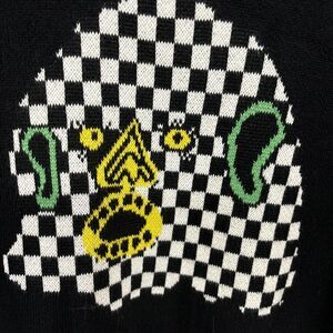 The sweater comes in size XS and features a black color with a check pattern that adds a touch of art and music to your outfit. Its hipster, grunge, and gothic themes make it perfect for those who want to express their unique style. This unisex adult sweater is a basic piece that can be paired with any outfit, making it a versatile addition to your wardrobe.