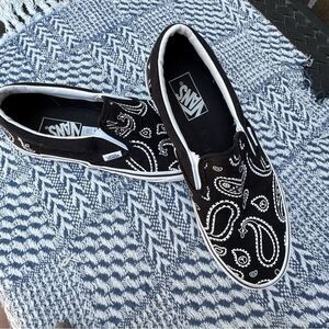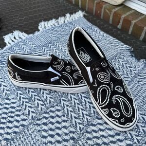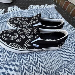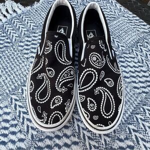 EUC Vans slip-ons featuring a bold black and white paisley pattern. Ideal for everyday style.