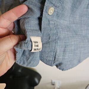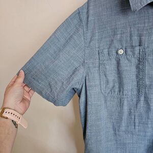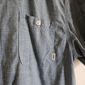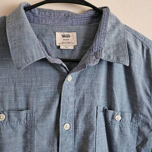 This is a light blue chambray button front shirt by Vans. It has short sleeves and pockets on each side of the chest.