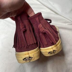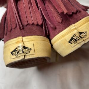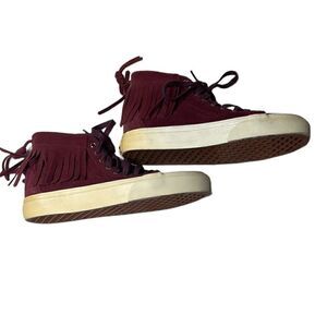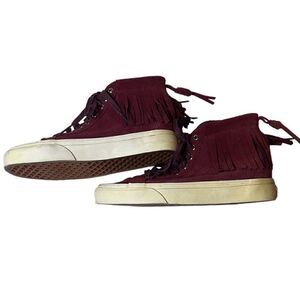 Vans High Top Red Suede Fringe Lace Sneakers. Size 6. Very good used condition. Has some yellowing on sole of shoe. Other than that they are in great condition.