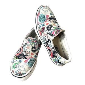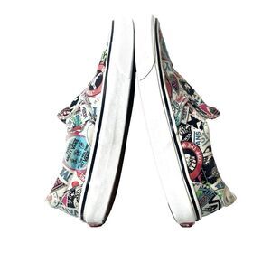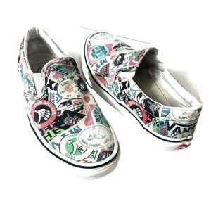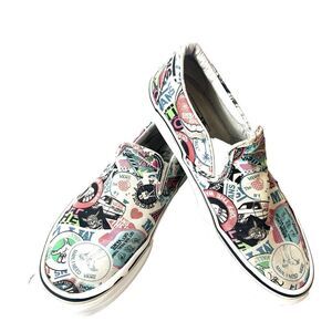 Vans Off The Wall Women's Size 8 Slip On Skater Sneakers with a unique Sticker Mash-Up design, also suitable for Men's Size 6.5. These canvas shoes are perfect for BMX or casual wear.