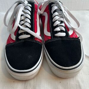 Vans Old Skool sneakers, featuring a red and black color scheme with white accents. The "OFF THE WALL" text is visible on the midsole. The Old Skool was the first shoe to feature Vans' signature side stripe, and has become an icon since its debut in 1977.