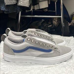 Vans old school sneakers in gray with blue stripe. Perfect for casual outings.