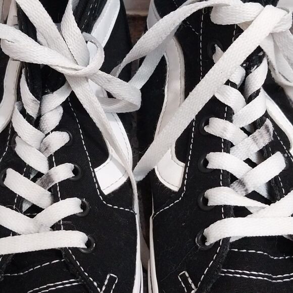 Iconic Vans high-tops in black and white. Ideal for everyday style. They are a size 10 and in almost perfect condition. The laces could be replaced but after the initial lacing it probably will be hidden from view. They are size 10 in womens. The high padded collar gives support beyond belief. The reinforced toe box offers classic style. They are perfect for skateboarding or for wear with skinny jeans !