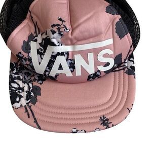 Excellent preowned condition Vans pink and black floral snapback trucker hat; bill is flat/hasn’t been curved.
