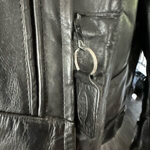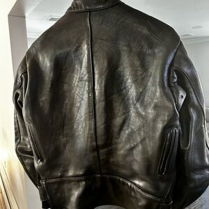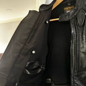 Classic black leather bomber jacket by Vanson. Features signature patches for a bold look.