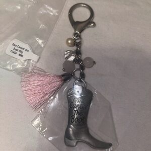 Silver Give Cancer the boot keychain featuring a pink tassel and decorative beads.