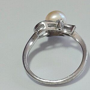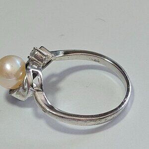 Pretty sterling silver vintage ring has a cream colored freshwater pearl accented with a clear rhinestone. Marked 925. Size 6.