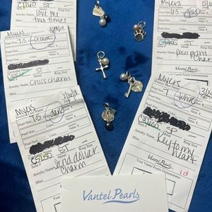 Beautiful, never worn silver Vantel pearl charms with dangling pearls. Each charm comes with blue Vantel mesh bag and tarnish deterrent strip. Sandollar charm has additional Seaglass dangle see pictures for description of pearls.