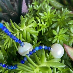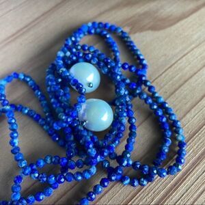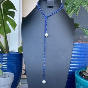 This is the "Atlantic Paradise Lariat". It has 11-12mm white pearls and Blue Lapis. It is approx. 40" and can be worn long, short, choker styled, or in a knot.